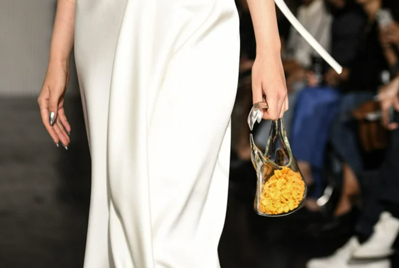 Golsfish em bolsas transparentes em desfile de Kate Barton